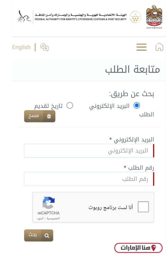 - البريد الإلكتروني أو تاريخ التقديم بحسب طريقة البحث التي تم اختيارها.
